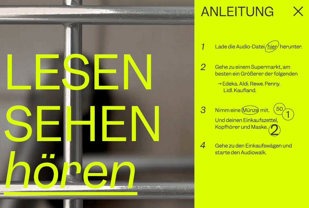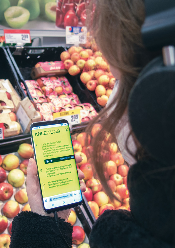“Serving Suggestion” is an audio walk that deals with seasonal employment in agriculture. As consumers, we are often unaware of the background to food production. The media provide an insight that is often one-sided and does not represent the complexity. The audio walk is a situational practice that relocates production to the supermarket and gives a stage to unheard voices. Based on interviews, the complexity and everyday life of seasonal workers and farmers in the Berlin area are juxtaposed. The aim is to impart knowledge to consumers while shopping and to expand the space of the supermarket to include the level of production.